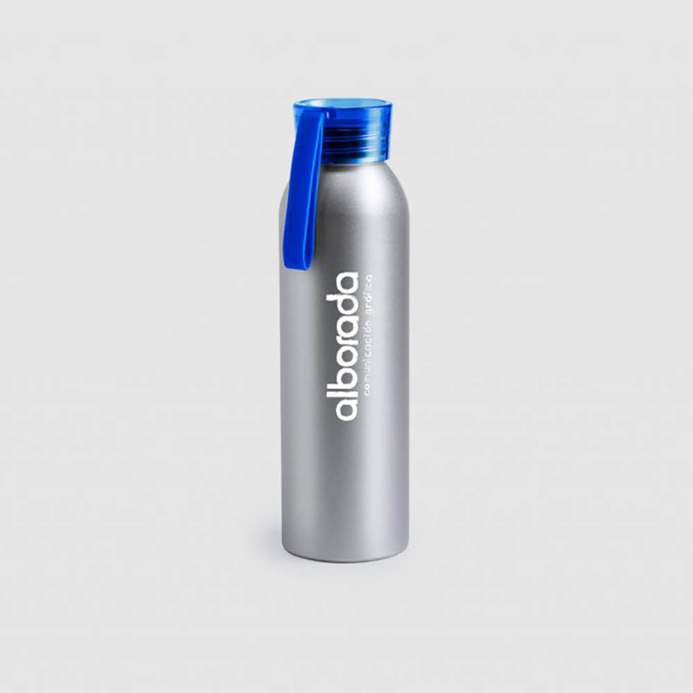 Bidon térmico para bebidas de aluminio con capacidad para 650 ml. Cuerpo en color plateado, con tapón de seguridad a rosca en variada gama de colores. Cinta de transporte a juego. Altura de 23 cm. y diámetro de 6,6 cm. Su peso total es de 96 gr.