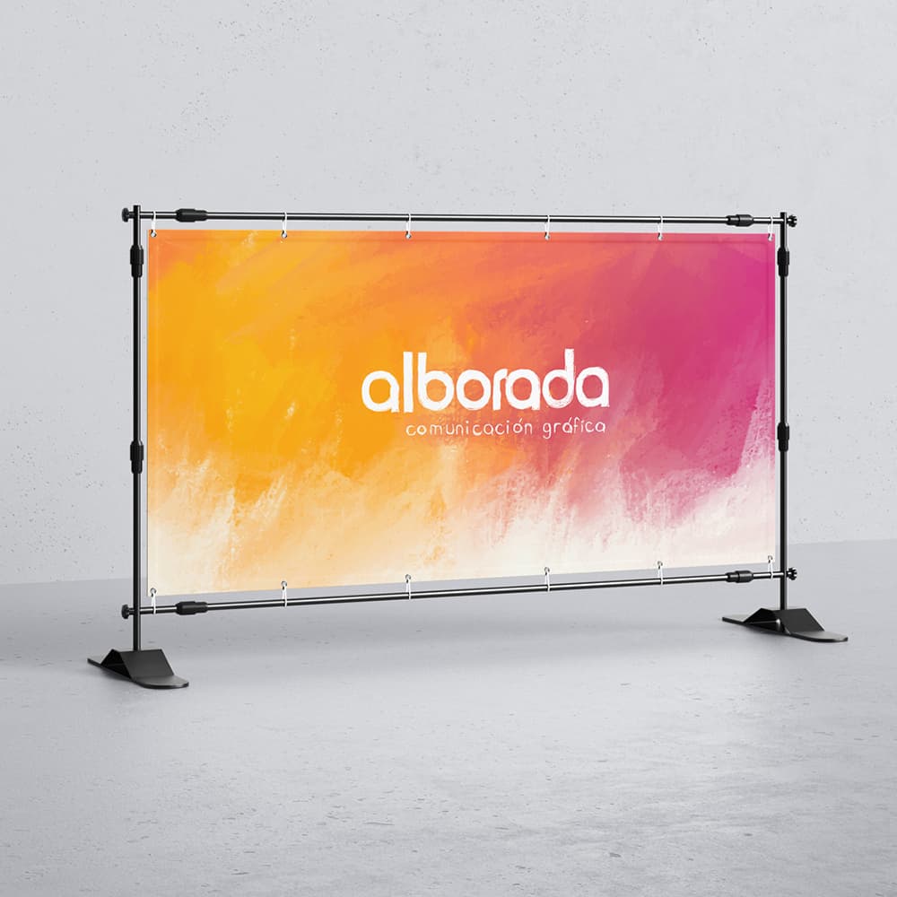 También puede presentarse con ollados y remaches para su sujeción con cintas o elementos metálicos sobre peanas de suelo y bastidor telescópico ajustable de metal (de fácil montaje y colocación)