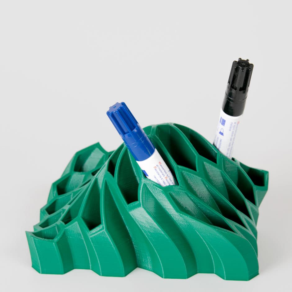 Portalápices diseño cráter fabricados con material biodegradable y sostenible (PLA) sobre impresión 3D en color negro, verde o glitter que incluye tarjetero integrado. Es imprimible mediante tampografía en diferentes colores.