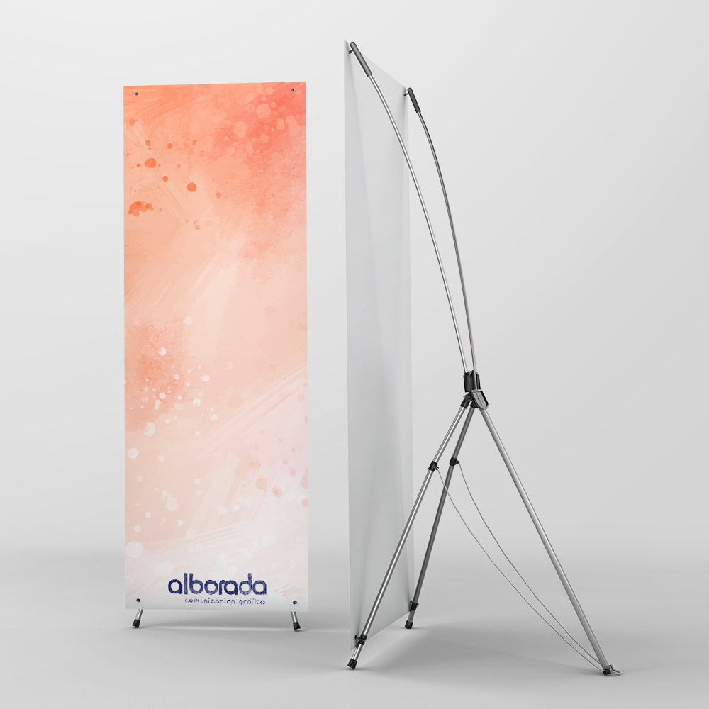 El x-banner se compone de unas varillas de PVC que se unen mediante un soporte-tensor. La lona impresa medida 160×60 cm. Se entrega con unos ojales metálicos en los extremos para introducir los tensores y que de esta forma la gráfica impresa queda tensa y sin arrugas. La estructura es desmontable e incluye una bolsa negra para el transporte.